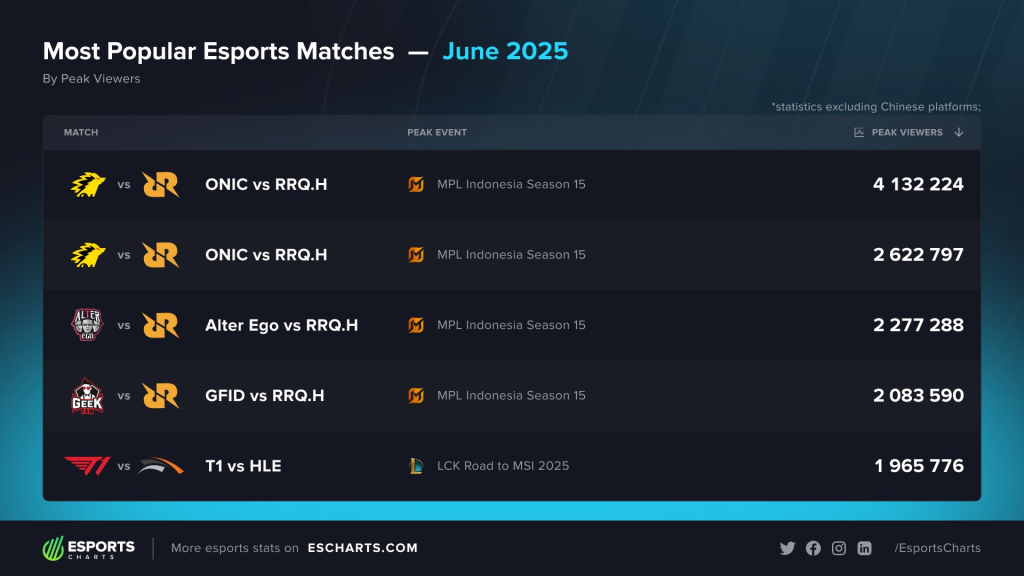 Mobile Legends: Bang Bang didn’t just show up in June — it took over. The mobile MOBA smashed through the global esports viewership rankings, claiming four out of the five most-watched matches of the month, according to Esports Charts.